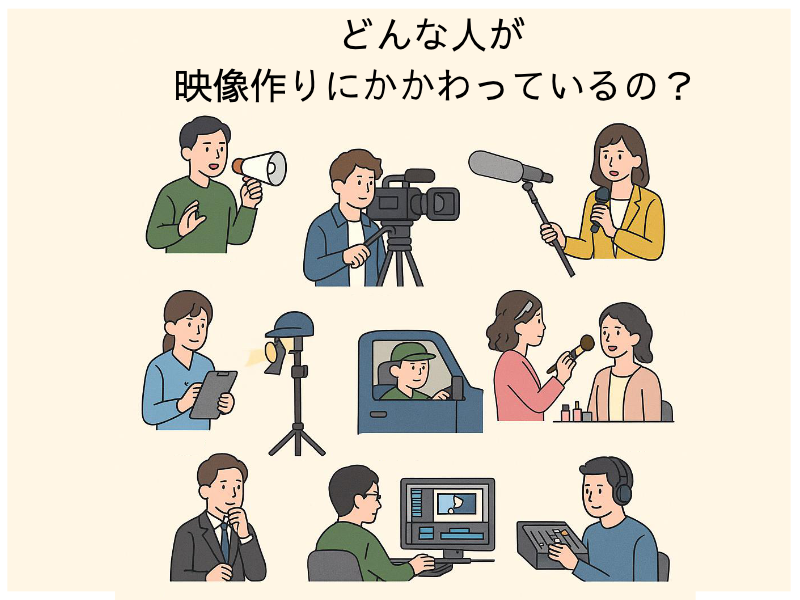 テレビ番組の映像制作、関わっている職業はこんなにある! テレビ番組や企業映像、CMなどを見ていて「この映像、誰が作っているんだろう?」と思ったことはありませんか? 映像制作の現場では、見えていないところで実に多くの人が関わり、それぞれの役割を担っています。実は、一番コンパクトな撮影現場でも最低2~3人のプロが関わっており、おおがかりな映像を作るときには10人以上のチームになることも珍しくありません。 今回は、映像制作の裏側で活躍している「縁の下の力持ち」たちをご紹介します。