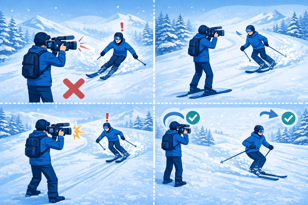 正面から滑ってくる姿を撮ろうとすれば、カメラが進行を妨げてしまうリスクもあるため、 左右どちらかから避けて撮影するのが通常です。
