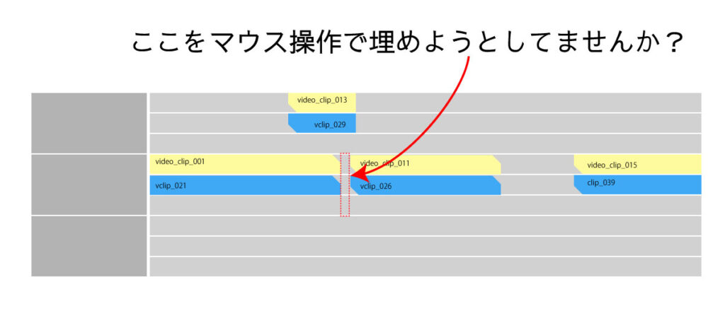 例えば、「こっからここまでのクリップをもう少し短くしたいな…」という時、ついつい一つずつドラッグして短くしたり、クリップをカットして時間を削ったり以外とこれを「マウスを使って手動で行ってしまう人」がいます。
