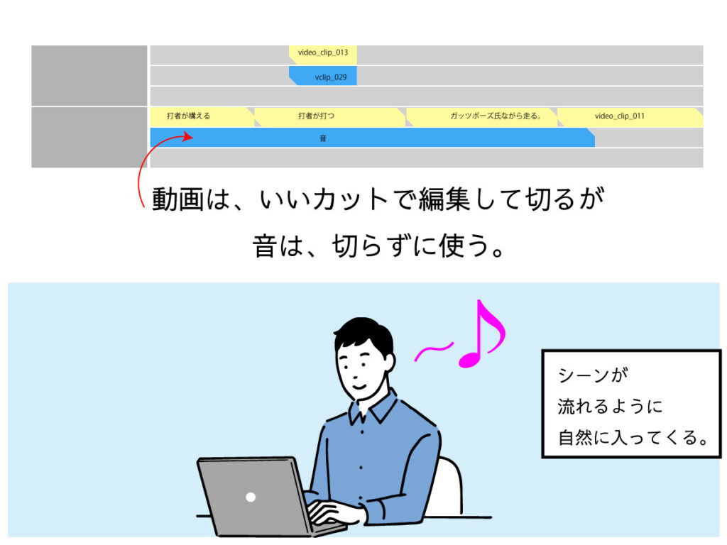ユーザー側に1連のまとまりとして見せたい場合は、音声は映像に「潜り込ませる」ようなイメージで調整すると、自然な流れを作ることができます。
